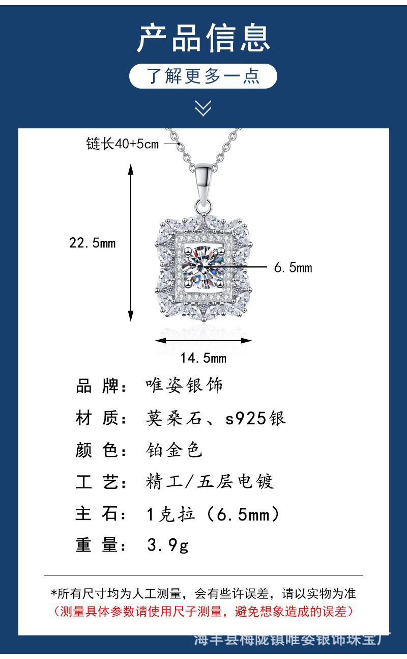 In terms of design, the necklace is carved through exquisite diamond treatment techniques, presenting a high - grade and elegant temperament. There are two color options: 6.5mm high - carbon stone and 1k moissanite. The pendant is made of 925 silver, and the chain is a classic cross chain. The overall shape is geometric, integrating the popular quadrangular element, and the style is a light luxury style with an affordable price. The chain length ranges from 41 cm (inclusive) to 50 cm (inclusive), which is of suitable length.